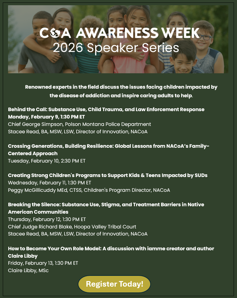 NACoA provides its expertise at a variety of events both online and in-person. Designed to enhance the skills and knowledge of program group leaders, educators, faith leaders, behavioral health professionals, or any caring adult interested in helping children, families, and communities impacted by parental addiction.