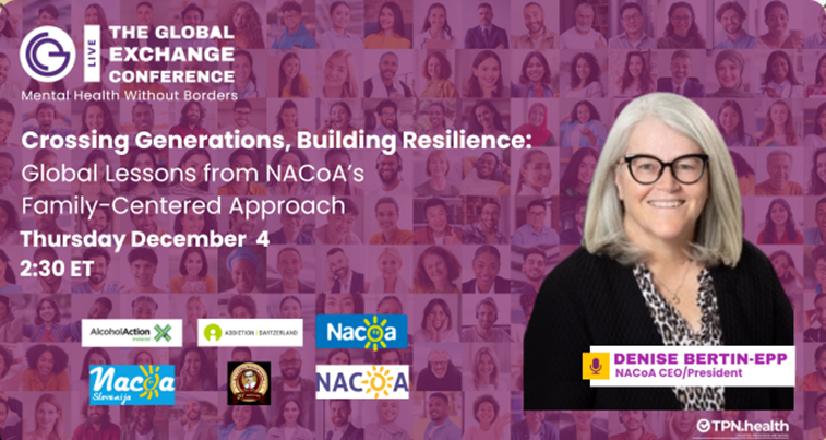 NACoA is proud to have CEO/President Denise Bertin-Epp RN, BScN, MSW present at this year's online Global Exchange Conference: Thursday, Dec 4 at 2:30 pm ET. The session Crossing Generations, Building Resilience: Global Lessons from NACoA’s Family-Centered Approach spotlights how to support children affected by parental substance use through scalable, culturally responsive, family-centered interventions used around the world that build resilience, interrupt intergenerational harm, and promote equity and accessibility across diverse communities. This session will feature initiatives from NACoA international Allies: AV Baliga Memorial Hospital, Addiction Suisse, Alcohol Action Ireland, NACoA Deutschland, NACoA UK, NACoA Slovenija.